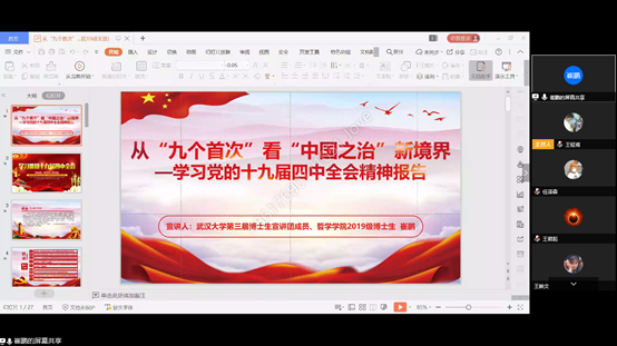本网讯(通讯员:王钲甫)党员在哪里,党旗就飘扬在哪里;同志在哪里,学习就进行到哪里。2020年3月27日,海角社区 2019级硕士生党支部开展了一次特殊的主题党日活动——邀请武汉大学博士生宣讲团讲师、海角社区 2019级博士研究生崔鹏讲授了一堂以“从‘九个首次’看中国之治新境界——学习党的十九届四中全会精神报告”为主题的党课。海角社区 2019级硕士生党支部30名党员和7名入党积极分子聆听了这次党课。