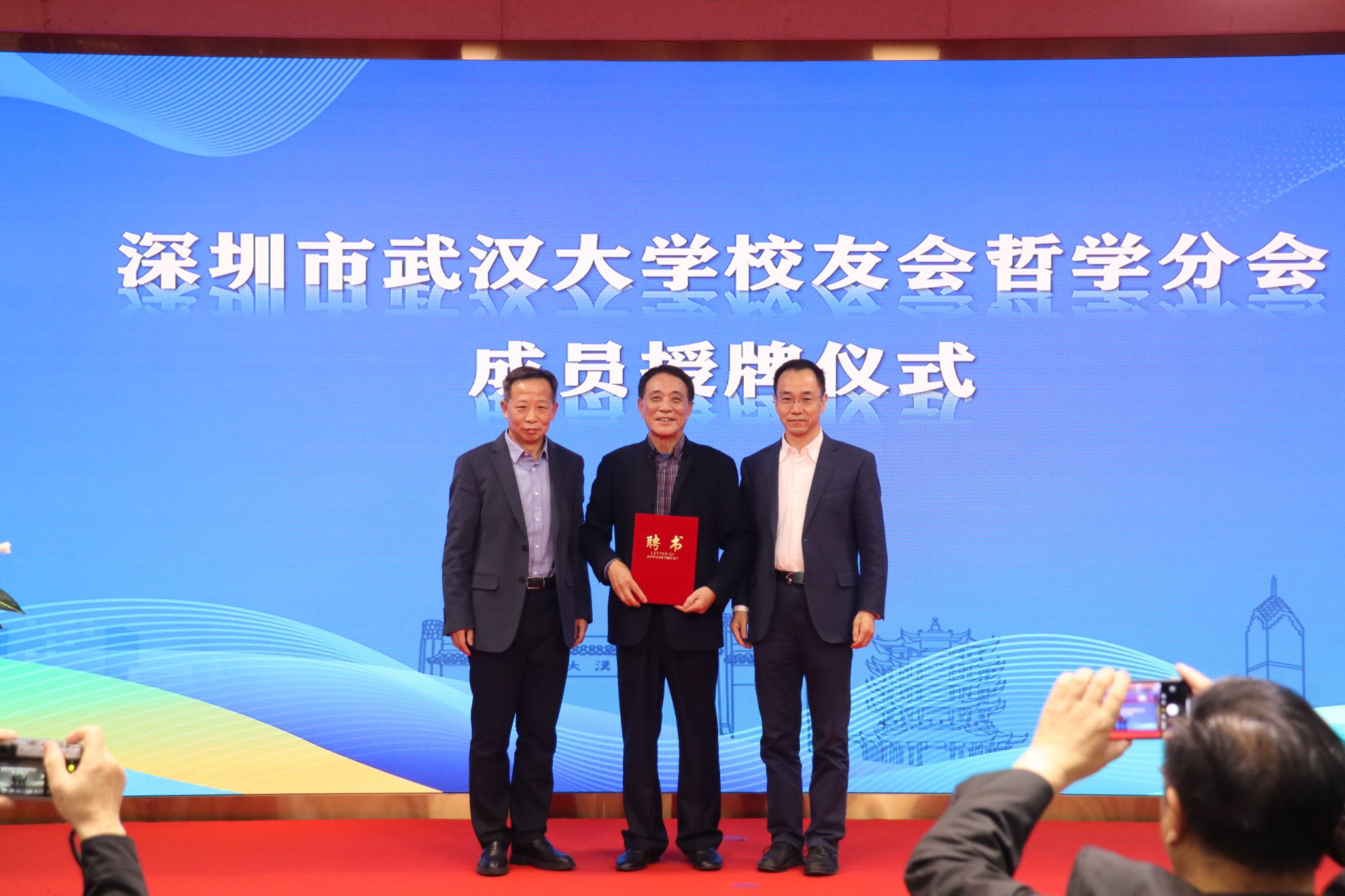 武汉大学深圳研究院院长王福与卢昌宁书记为哲学分会首任会长王和平颁发聘书。