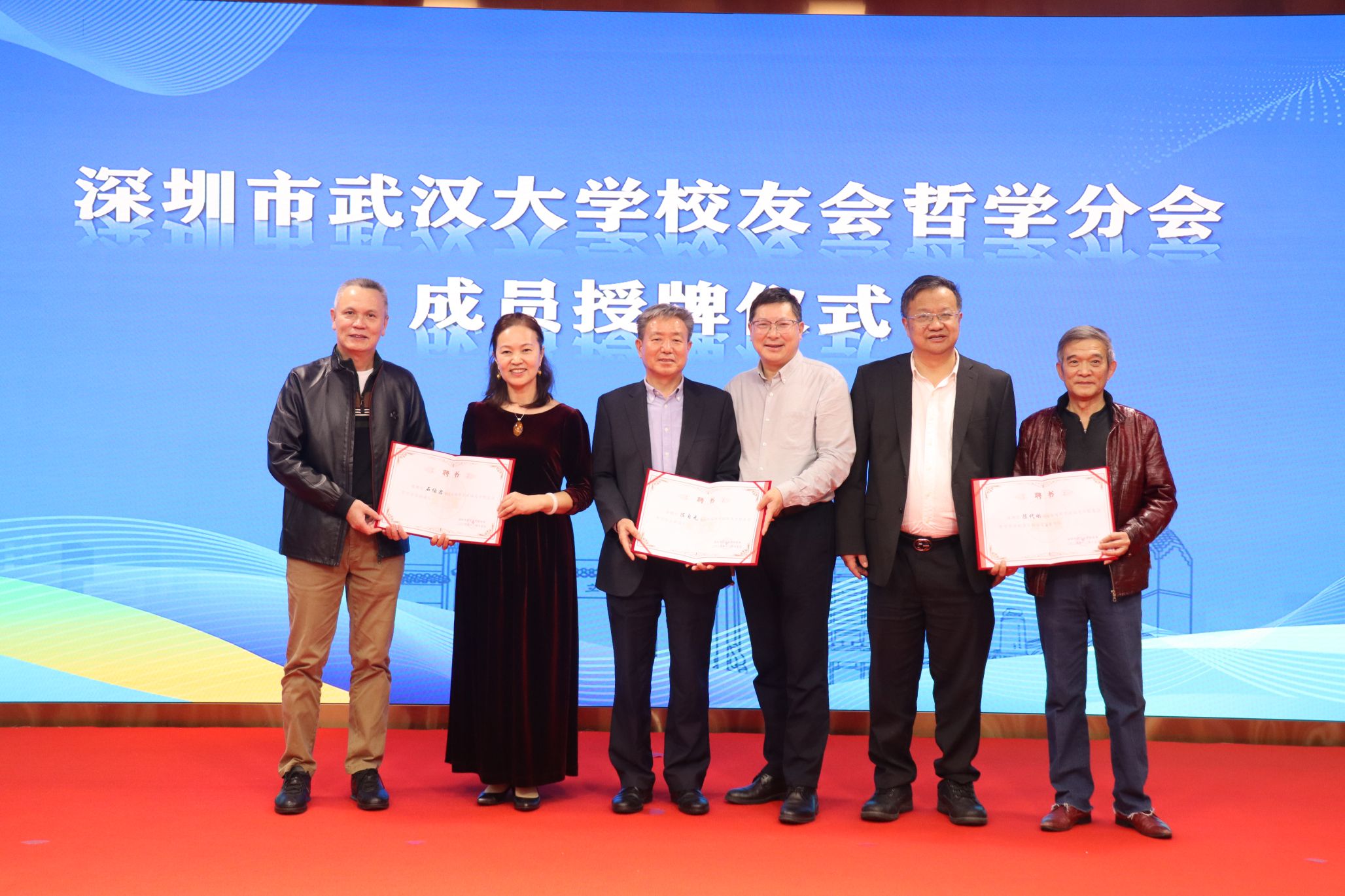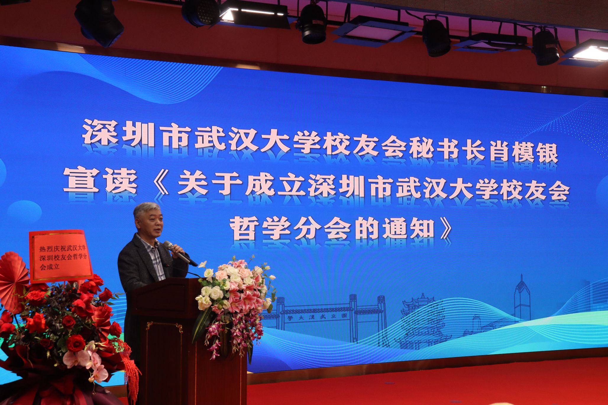 武汉大学深圳校友会秘书长肖模银宣读了《关于成立深圳市武汉大学校友会哲学分会的通知》,武汉大学深圳校友会哲学分会正式成立。大会推举并一致通过1978级校友王和平为哲学分会第一届会长,陈代刚、陈自元、石佑君、叶春辉等校友担任副会长,陈代刚校友兼任秘书长。