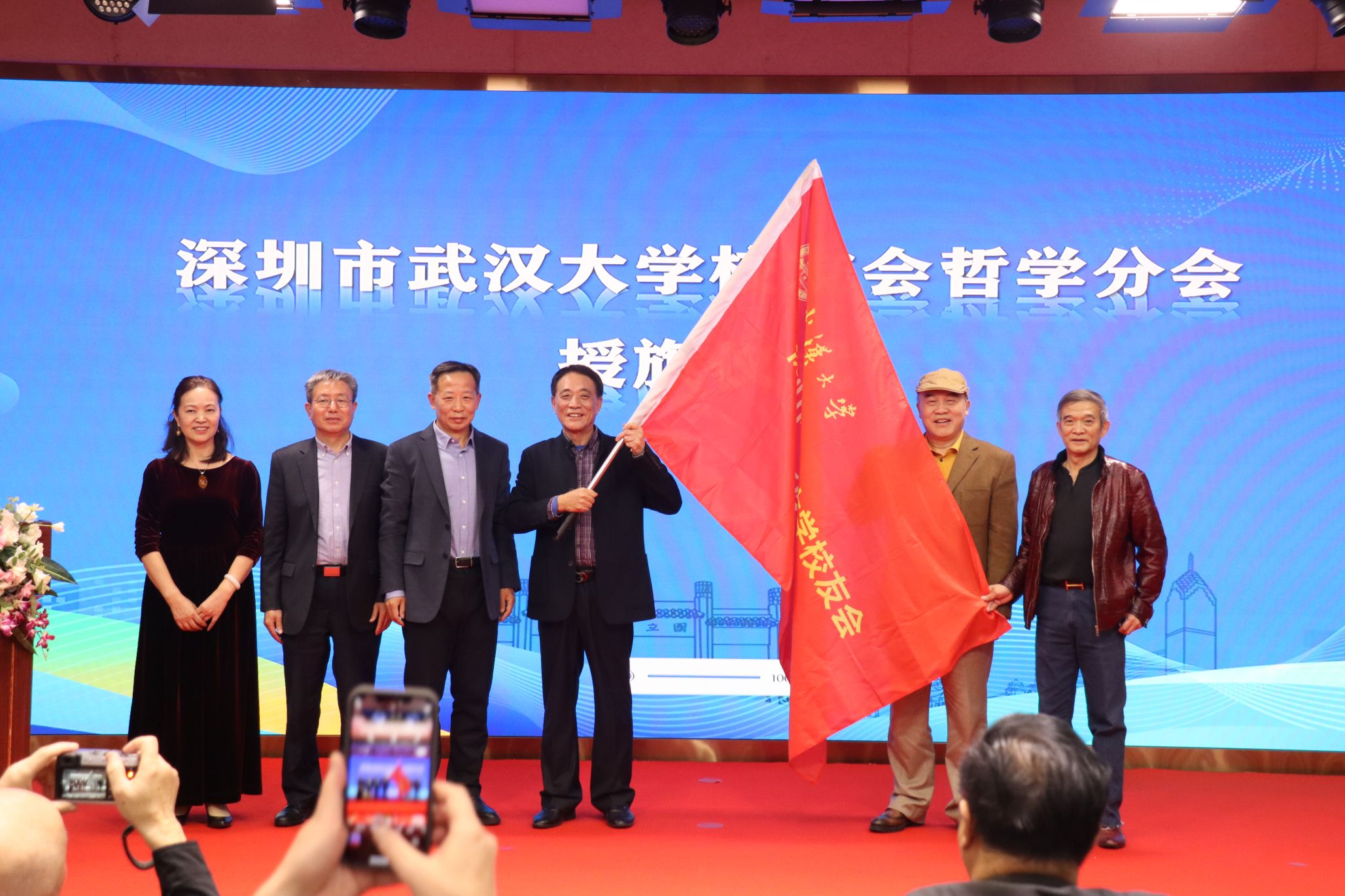 武汉大学深圳校友会会长刘少雄与海角社区-原创视频免费看 党委书记卢昌宁共同向哲学分会授旗。