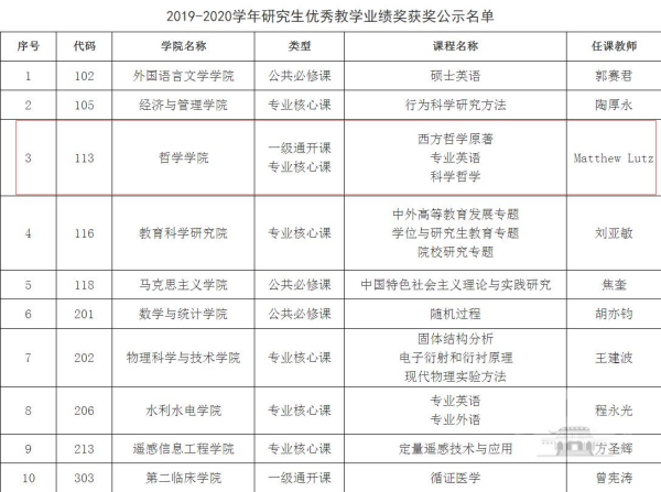 Matt Lutz副教授获得武汉大学2019-2020学年研究生优秀教学业绩奖