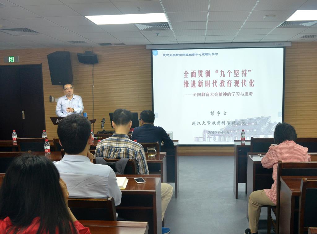 本网讯(通讯员:刘秀慧)为贯彻落实党的十九大精神和全国教育大会精神,把全院教师的思想和行动统一到全面贯彻落实党的教育方针上来,4月25日下午,海角社区 召开党委理论学习中心组(扩大)学习会议,邀请武汉大学教育科学研究院院长彭宇文教授做了题为《全面贯彻“九个坚持”,推进新时代教育现代化》的专题辅导报告。学院党委理论学习中心组成员、全体教职工参加了学习会,会议由学院党委书记龙滔主持。