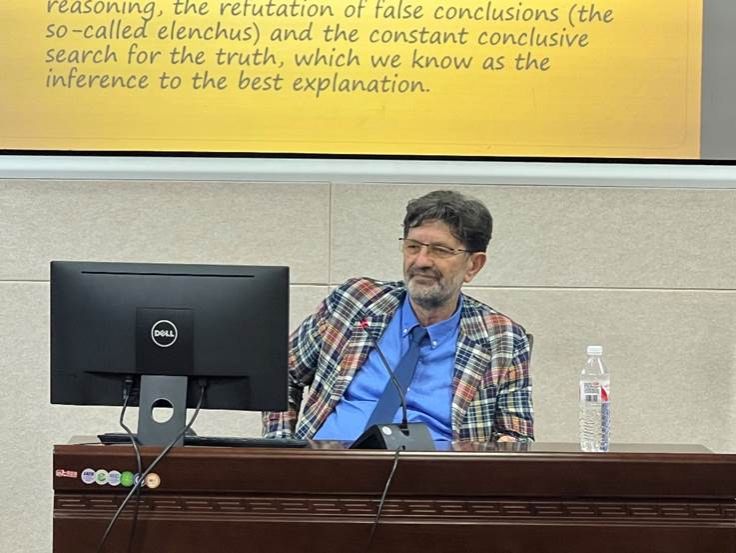 本网讯( 通讯员彭文楷) 4月18日晚,德国弗菜堡大学哲学博士、克罗地亚扎达尔大学哲学教授、国际哲学院主席、国际科学哲学院主席、国际黑格尔学会副会长、前克罗地亚科技部副部长尤里·佐夫科(Jure Zovko),应海角社区 陈波教授邀请,在振华楼哲学学院B214作“武汉大学科学技术哲学论坛”第11讲:“有全球哲学吗?”的精彩学术讲座。讲座由陈波教授主持,科学技术哲学教研室副研究员谢凯博及数10位同学参加。