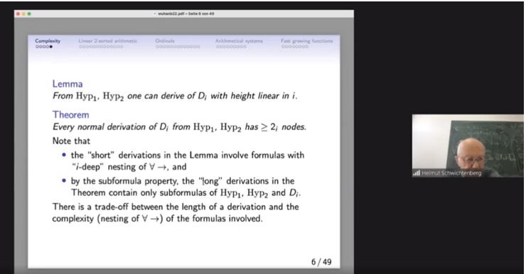 越大,与多项式的差和商也会越来越大。这就是所谓的复杂性,它让穷尽所有公式的正规推演变得不可行,证明的范式的“复杂性”通过这个例子得以体现。然后,Schwichtenberg教授围绕着线性双层算术(linear two-sorted arithmetic)、序数(ordinals)和算术系统的复杂性问题展开,讨论算术系统中的复杂证明。Schwichtenberg教授介绍了算术理论的序数分析的重要结果,相关定理的证明环环相扣。