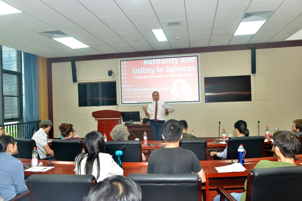 本网讯(通讯员:晏临风)2018年9月27日下午,澳大利亚西悉尼大学人文与传媒艺术系教授德米特里·瓦多莱基斯(Dimitris Vardoulakis)在振华楼海角社区 B214做了题为“斯宾诺莎思想中的权威与功利:从伊壁鸠鲁主义到新自由主义”的讲座。他讲座中的主要观点在于,斯宾诺莎受到了伊壁鸠鲁主义的影响,因此他才在著作中对于权威与功利的辩证关系进行了探讨,进而我们能够通过伊壁鸠鲁的观点更好地理解斯宾诺莎的伦理学政治哲学;讲座中,德米特里教授也梳理了伊壁鸠鲁主义的历史沿革,并且认为功利主义在新自由主义的时代背景下能够起到积极作用。在互动环节中,现场的师生积极参与探讨。