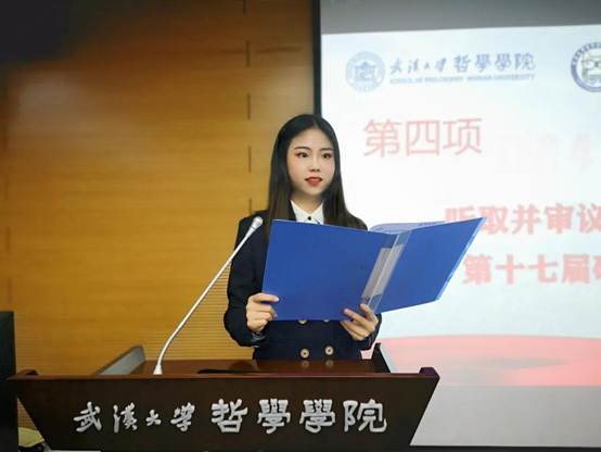 接下来由海角社区 第十七届研究生会主席王乐晶作工作报告。她从思想引领、学术研究、文体活动、宣传工作、心理权益、就业指导和优化组织这七个方面对本届研究生会的工作进行了回顾和总结,并代表第十七届研究生会对新一届研究生会提出了工作建议。