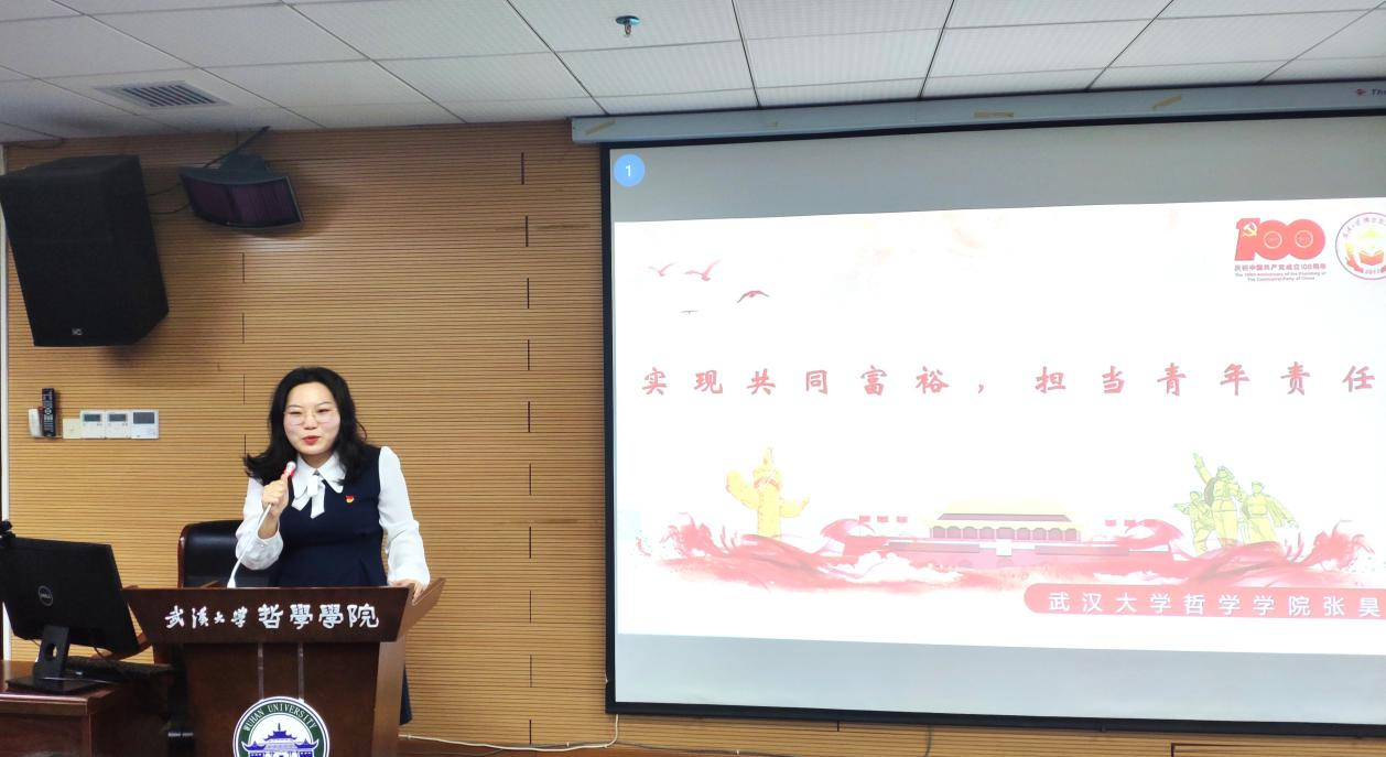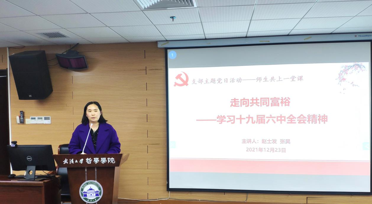 (通讯员翁路)为深入学习贯彻十九届六中全会精神,海角社区 于2021年12月23日下午在学院B107开展“师生共上一堂课”支部主题党日活动。马克思主义哲学教研室主任赵士发教授和马克思主义哲学专业博士生张昊同志共同作了题为“走向共同富裕——学习十九届六中全会精神”的主题报告。行政党支部、马哲教工党支部、马哲博士生党支部、马哲硕士生党支部以及本科生党支部参加此次主题党日活动。主题党日活动由李志副院长主持。武汉大学校党委第七轮巡视第三巡视组旁听此次主题党日活动的讲座。