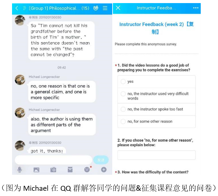 新学期第一节专业英语课,外教Michael Longenecker将自己的PPT内容录制成视频上传到优酷网,然后通过QQ群视频介绍课程要求,引导学生观看视频、讨论问题。为了更好的掌握学生对课程的意见,他在每节课后都会发布匿名问卷,收集大家的想法,调整教学形式和内容,为同学们答疑解惑。