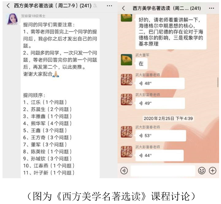 中哲教研室的连凡老师开设了《中国哲学史料源流举要》一课,前几次课主要讲授了如何用软件整理文献、运用各种数据库获取资料等。他认为:“对于基础文科而言,网上教学和研究是一种非常好的形式,不像理科需要实验室。通过QQ群直播分享屏幕就可以展开教学,如演示如何检索数据库、查找资料等。其次,大家在群里提问、讨论会放得开,互动很好,也有很多同学课后会单独跟我聊一些学术问题,非常方便。在后面的课中也会安排专门的讨论课。我想,即便是恢复正常教学了,还是可以延续这种方式,有的教室投影仪经常出问题,线上授课就可以应对投影设备的突发故障。”网络课堂为同学们提供了一个良好的讨论环境,在彭富春老师的《西方美学名著选读》课上体现的尤为明显。18级的博士生贺琼萱担任了这门课的助教,她在微信群有条不紊地组织着群内讨论,师生互动热烈,有的同学准备了3-4个问题,也只能“排号”,等老师一个一个解答。