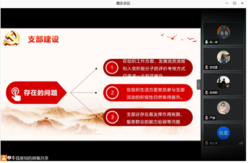 充分交流过后,大家又对支部建设问题进行了讨论。钱亚琼同学指出,支部现在还存在一些问题,在组织工作方面,发展党员流程和请假入党积极分子考核方式仍需进一步规范提升;组织生活方面,支部党员参加支部活动的积极性仍应加强;支部还存在发挥力量有限、服务党员和群众不够有力等问题。支委会成员分别就自己的工作做出了批评了改正意见,呼吁支部党员加强对支委的监督,党员同志们也分别提出了建议。