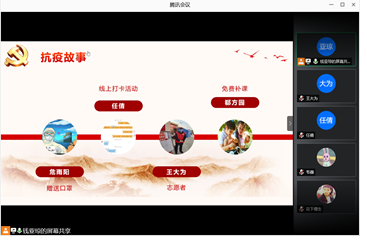 首先,任倩、王大为、郗方园、危雨阳四位同志分享了他们在抗疫期间从事的志愿工作,激励支部其他党员立足岗位、勇于担当。
