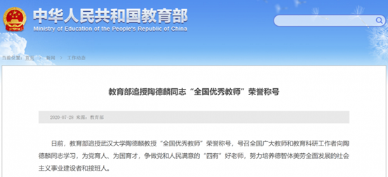 日前,教育部追授武汉大学陶德麟教授“全国优秀教师”荣誉称号,号召全国广大教师和教育科研工作者向陶德麟同志学习,为党育人、为国育才,争做党和人民满意的“四有”好老师,努力培养德智体美劳全面发展的社会主义事业建设者和接班人。