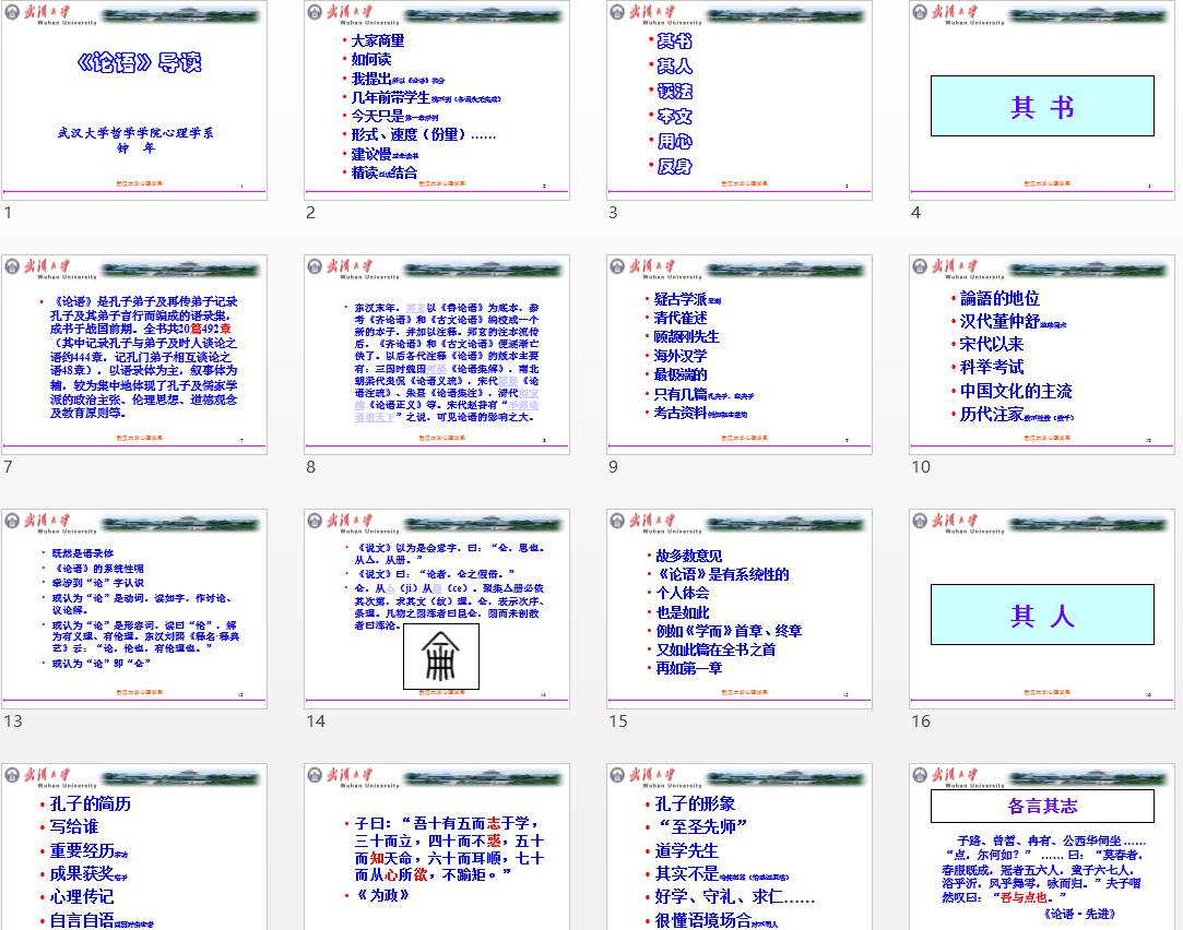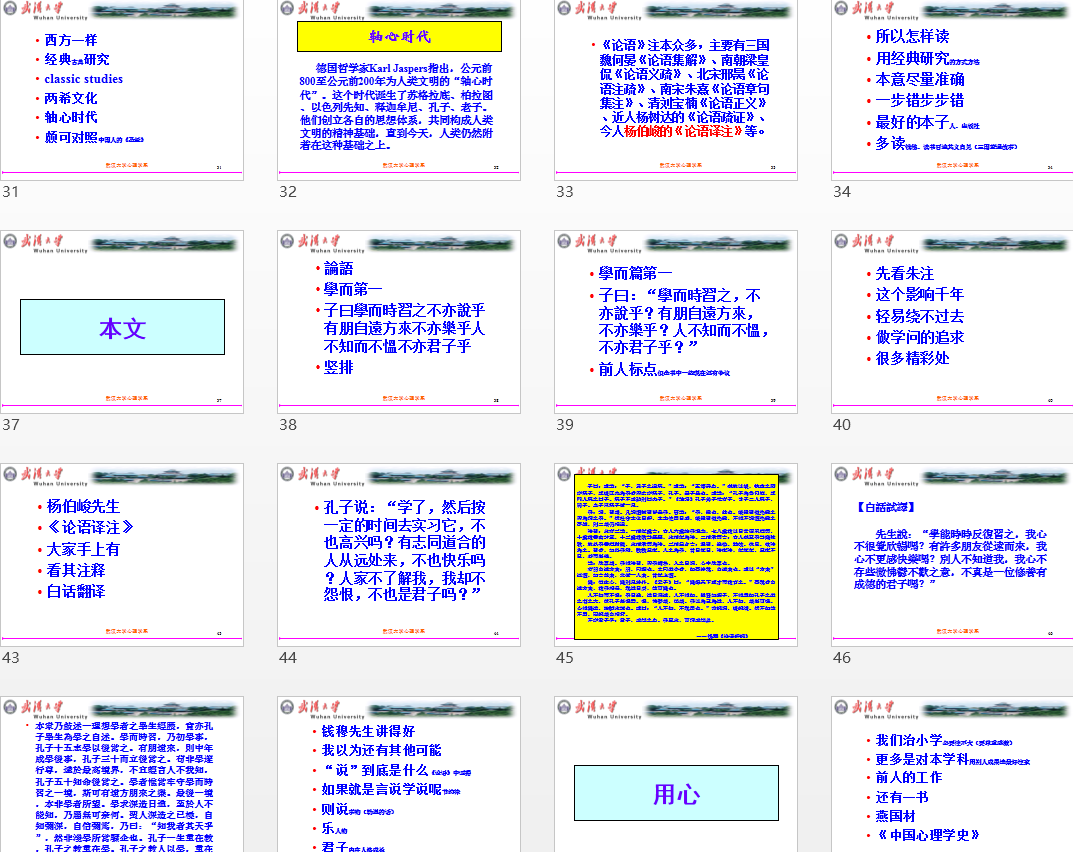 第二部分“其人”,钟老师为我们简单介绍孔子的生平,根据以往专家将孔子一生分为很多阶段,并在发展心理学角度为我们总结解读各个社会化阶段孔子的特征,15岁前少年贫困,青年发奋努力(15到30岁),办学成名(30岁到50岁),在“学而优则仕”理念下短期从政(50到55岁),在艰苦动荡环境中周游列国宣传治国思想(55-68岁),返鲁从教(68岁--去世)。同时引出孔子自己的“心理”传记--子曰:"吾十有五而志于学,三十而立,四十而不惑,五十而知天命,六十而耳顺,七十而从心所欲,不逾矩”,钟教授启发我们去站在心理学角度看,孔子心理传记可能是写给自己,是一种自我认知,当然也是一种人格成长阶段总结,这可能给我们研究人格心理学提供一些启发。