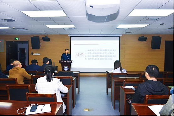 接着,由龙滔书记讲授了题为《铸优良师德师风塑校园清风正气》的廉政党课,龙滔书记首先带领全体学习了教育部近年关于高校师德师风有关要求和武汉大学教师师德失范行为处理办法,并就如何全面理解把握教育部和学校的要求,提出了几点要求,一是要提高政治站位,增强“四个意识”;二是要把握基本定位,增强底线意识; 三是要正确理解认识,取得思想一致。最后龙滔书记就如何深入落实教育部和学校的要求,从“慎思”、“慎言”、“慎始”、“慎友”、“慎独”、“慎微”、“慎好”分享了自己的体会,与全体教师共勉。