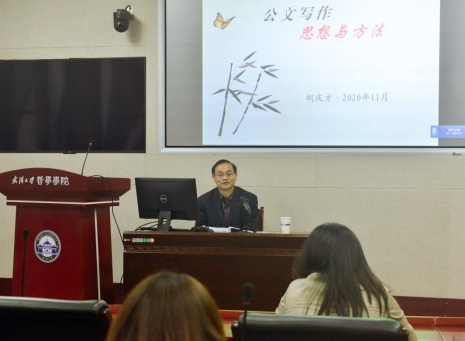 本网讯(通讯员 赖颖冰 丁丽娜)为加强学院管理队伍能力建设,提升教职工公文写作水平,提高公文质量与运行效率,学院于11月5日下午在振华楼B214会议室举办公文写作培训,特别邀请武汉大学党政办公室副主任胡庆方老师作专题报告。培训由党委副书记、工会主席刘义胜主持,学院全体行政管理人员参加了培训。