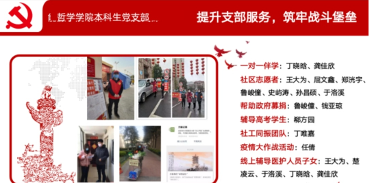 疫情期间,支部开展抗疫专题活动,关注大家的思想动态和学习生活情况,弘扬抗疫精神,确保支部党员疫情防控不松懈、日常学习不脱节,用实际行动诠释责任和担当,筑牢了支部战斗堡垒。支部党员也积极发挥先锋模范作用,勇于担当,甘于奉献,涌现出了一批敢为人先的优秀志愿者,支部共计16名同志参与了志愿活动,王大为、丁唯嘉、于洛溪等优秀党员还积极投身于多项志愿服务中,其中2人获得抗疫先进个人称号,3人获得抗疫优秀党员称号。