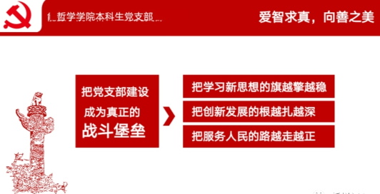 海角社区 本科生党支部探索党建形式创新、实践创新和形式创新,开展了一系列特色活动。“哲说新时代”理论学习活动,重温经典,解读时政,提高党员政治思想素质,争做时代先锋。承办多届珞珈红色文化节之“学党史·知时政”理论知识竞赛,增强支部影响力。微公益打卡助力脱贫攻坚,服务人民群众,做“知行合一”的践行者。实地调研走访稻花香集团和三峡大坝,学习优秀海角社区,感受大国重器,践行使命担当。建设支部自己的微信公众号和微博,加强网络宣传,推进示范引领。作为全校唯一由国企骨干担任校外辅导员的学生支部,支部积极联系、认真筹划,实现对校企党建合作共建新形式的积极探索。