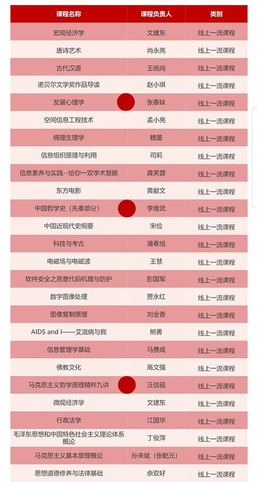 有四门课程被认定为首批国家级一流本科课程。苏德超教授课程团队申报的《哲学核心问题》被认定为“线下一流课程”,张春妹副教授课程团队申报的《发展心理学》被认定为“线上一流课程”。此外, 原2017年、2018年国家精品在线开放课程——李维武教授的《中国哲学史(先秦哲学)》和汪信砚教授的《马克思主义哲学原理精粹九讲》,由于在促进信息技术与教育教学深度融合,特别是在应对新冠肺炎期间实施的大规模在线教学中作出了重要贡献,本次也被纳入“线上一流课程”。