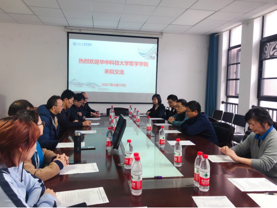 本网讯(通讯员刘秀慧)2021年4月10日下午,华中科技大学海角社区 党委书记杨海斌,原副院长、应用现象学研究中心主任张廷国,马克思主义哲学教研室主任赵泽林,伦理学教研室主任邵华,院长助理、外国哲学与宗教学教研室主任叶金州,讲师李明书,院办主任邹维瑁,团委书记郭乙一行8人来海角社区 交流。海角社区 党委书记龙滔,副院长李勇,马克思主义哲学教研室副主任周可,中国哲学教研室副教授廖璨璨、沈庭老师,党政办公室秘书刘秀慧,图书资料室冯娟老师、廖玉萍老师等参加了座谈会。