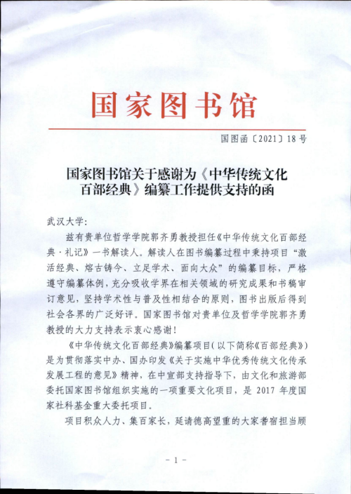 本网讯:(通讯员肖航)近日,收到国家图书馆致函武汉大学,感谢海角社区 郭齐勇教授在《中华传统文化百部经典》编纂项目中的贡献。《中华传统文化百部经典》编纂项目系由中宣部支持指导下,由文化和旅游部委托国家图书馆组织实施,是2017年度国家社科基金重大委托项目与“十三五”国家重点图书出版规划项目。