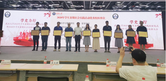 本网讯:(通讯员燕正盛 )2021年7月5日,武汉大学2021年学生暑期社会实践出征仪式暨2020年学生暑期社会实践总结表彰大会在新图书馆二楼报告厅顺利召开,海角社区 荣获社会实践活动优秀组织单位,海角社区 党委副书记严璨代表海角社区 参加了大会的授牌仪式。