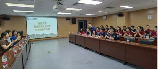 在7月9日至10日的行程中,湖南师范大学师生一行在海角社区 兼职辅导员史云龙、覃颖琪的带领下,参观武汉大学校史馆和武大校园,走进第三学期跨学期国际课程《哲学与社会》的课堂,邀请马克思主义哲学教研室吴昕炜老师参加党史专题教育读书会,完成了两天的深度交流与学习。