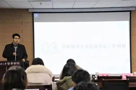 兼职辅导员史云龙老师带领现场全体寝室长学习了学院《寝室长工作细则》,并对寝室长权利和在寝室内务管理、安全管理、生活管理、参加培训等方面的职责范畴,进行了逐一讲解。