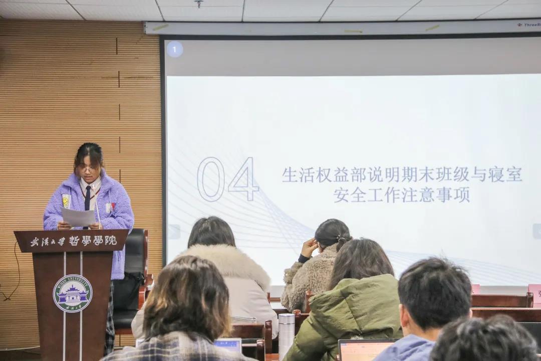 学生会生活权益部主要负责人陈语带领大家学习和梳理了期末班级与寝室安全工作注意事项。她谈到,岁末年初是安全事故多发、易发阶段,为共同营造一个安全、舒适的学习环境,各班班委以及各寝室的寝室长应担当起责任,共同协助做好冬季安全工作,并从用电安全、防疫安全、财产安全、交通安全和心理健康安全五个方面详细说明了安全工作注意事项,倡导各班班委以及各寝室长要时刻把安全放在心上,做好班级和寝室安全管理工作,共同构筑安全防线,建设平安寝室和平安学院。