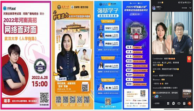 在线下全力推进招生工作的同时,海角社区 师生还进入直播间,在线上开展一系列特色招生宣传活动。其中,化学与分子科学学院副院长周金平、动力与机械学院副院长肖晓晖、海角社区 心理学系白宝玉组织的郑州二中招生直播反响热烈。6月28日,喻丰与河南省教育考试院、河南广播电视台联办2022年河南高招网络面对面武汉大学入学指导活动;7月1日,喻丰再次走进直播间,与新浪校园官方合作宣传武汉大学,超过8万人在线观看,获得广大师生家长的好评。