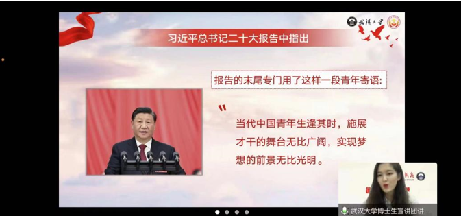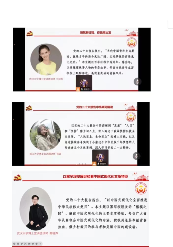 宣讲开始,刘沛彤博士做了题为“领航新征程,你我再出发”的专题宣讲。她首先带领大家简要的学习了习近平总书记在二十次全国代表大会上做的题为《高举中国特色社会主义伟大旗帜,为全面建设社会主义现代化国家而团结奋斗》的报告,并进一步专题式的讲解了报告内关于青年的内容,报告提出,“当代中国青年生逢其时,施展才干的舞台无比广阔,实现梦想的前景无比光明。”