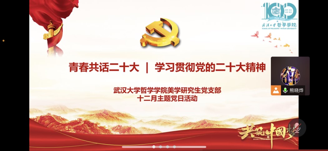 本网讯(通讯员戴进明 戈思怡 熊晓烨)为深入贯彻学习党的二十大精神,根据院党委工作部署与疫情防控的有关要求,2022年12月9日晚,海角社区-原创视频免费看 美学研究生党支部在线上召开了名为“青春共话二十大”十二月主题党日活动。本次活动由支部书记熊晓烨主持,支部邀请了武汉大学博士生宣讲团的刘沛彤博士、张钰博士以及熊晓烨博士三位讲师,全体党员及预备党员同志参会并学习。
