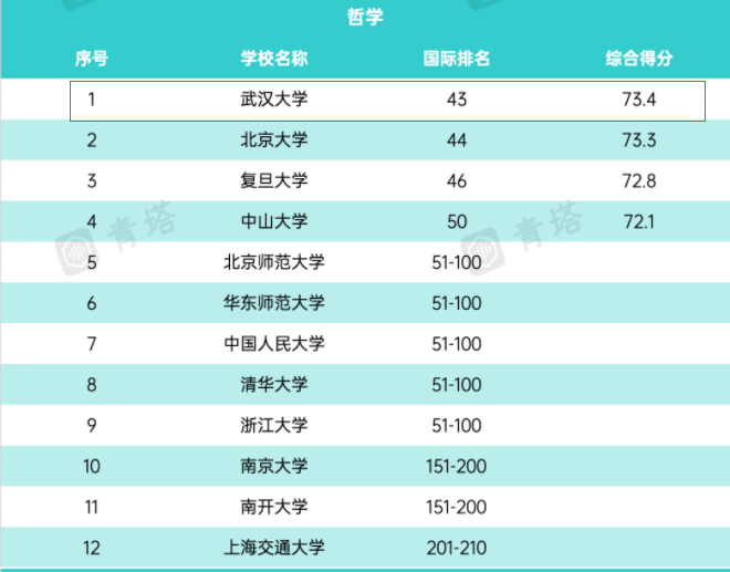 武汉大学哲学学科世界排名再创佳绩。在2022年世界排名第46、位列国内高校第三的基础上,2023年武汉大学哲学学科世界排名跃升至第43位,位列国内高校第一。