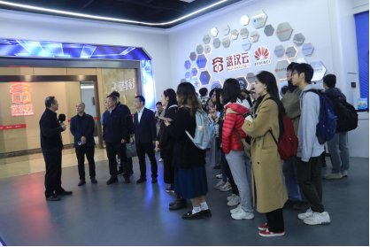 在调研第一站武汉云启智慧展厅,师生们了解到“武汉云”的项目背景以及它在新型智慧城市建设中发挥的重要作用。作为全国首个“城市一朵云”,“武汉云”采取企业投资、政府购买服务方式,由华为公司和武汉产业投资发展集团共同投资建设,2021年9月4日,“武汉云”正式启用,通过构建“城市运行管理中心、数字经济赋能中心、数字人才培养中心、科技创新孵化中心”四大中心,全面赋能政府管理、惠民服务、城市治理、产业创新、生态宜居五大重点应用领域,为新型智慧城市建设提供有力支撑。据介绍,武汉大学作为华中地区的重点高校,是武汉云的重点合作伙伴,为武汉云提供了很多人才和技术上的支持。同学们听完讲解心潮澎湃,期待自己将来能参与到武汉云的建设中,为打造数字武汉新名片贡献自己的一份力量。