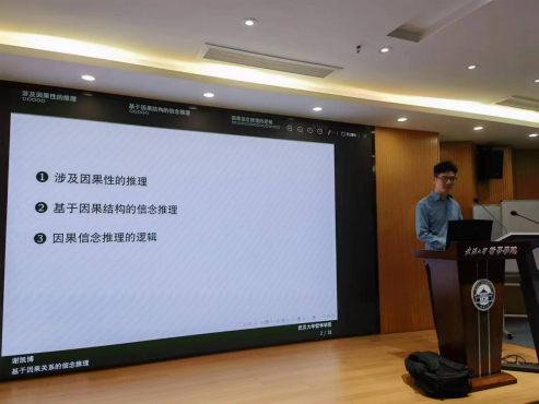 谢老师将涉及因果关系的推理分为了三类,并逐一讨论了人在这些认知过程中是如何利用因果结构进行推理的。在分析因果推理的一般特征后,谢老师着重介绍了基于因果结构的信念推理。结合具体例子,报告着重分析了因果信念推理具有命题相关性随信息更新不断变化的特征。为从形式角度刻画因果信念推理的逻辑,谢老师介绍了因果贝叶斯网、结构方程模型、认知模态词的克里普克语义等概念,以此为基础定义了因果信念推理的逻辑系统,并讨论了该逻辑的公理化等问题。