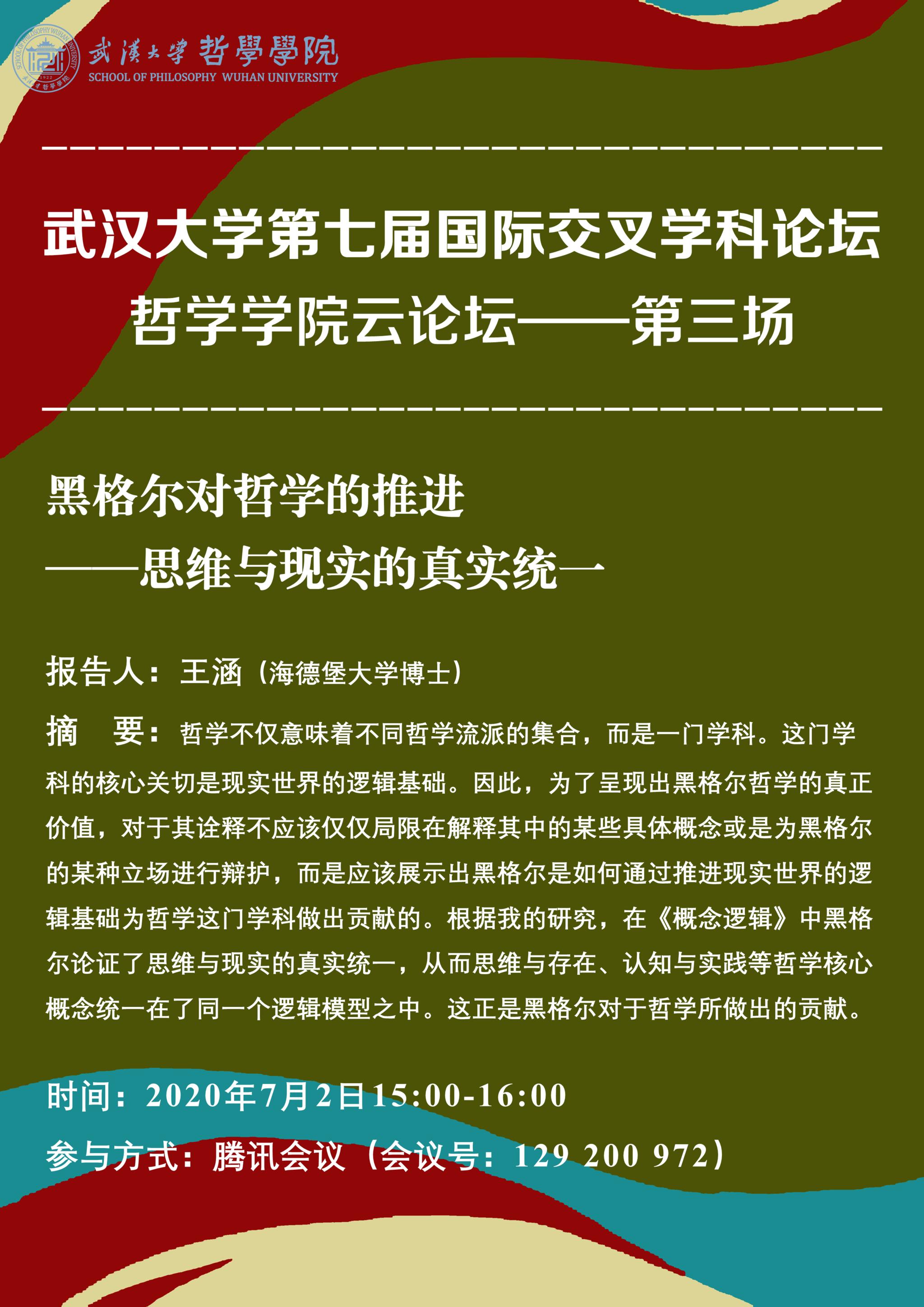 【7月2日】武汉大学第七届国际交叉学科论坛 海角社区 云论坛——第三场:黑格尔对哲学的推进——思维与现实的真实统一