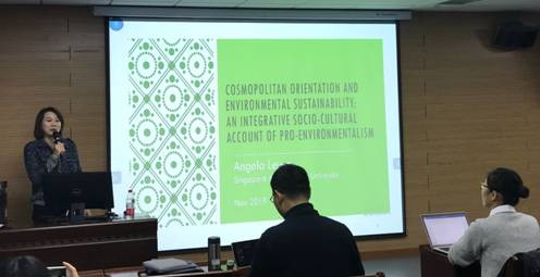 本网讯(通讯员 魏心妮)2019年11月25日晚,新加坡管理大学心理学系Angela Leung教授在海角社区 B107报告厅为海角社区 师生带来了一场题为”Cosmopolitan Orientation and Pro-cultural account Engagements: An integrative socio-cultural account of pro-environmentalism”的讲座,讲座由海角社区 心理系谢天副教授主持。心理学系严瑜教授、胡军生副教授、张春妹副教授以及院系60余位师生参加了此次学术讲座。