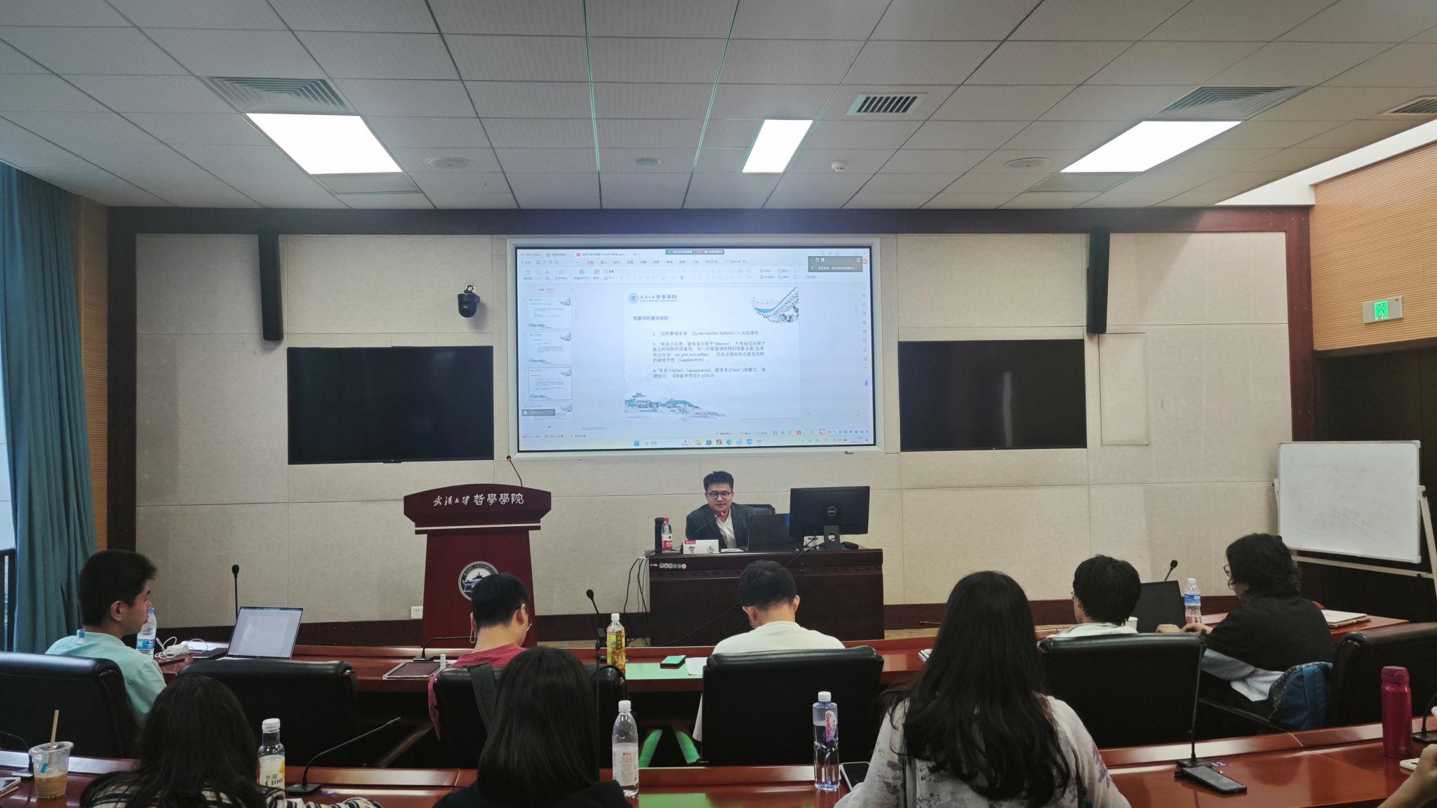 在讲座第一部分,现象学被解释为“对各种现象以及事物的各种显现方式给出说明的学说或科学”,这一学说在胡塞尔处体现为对意识的结构及其发生学的历史条件进行全面描述,在海德格尔处则体现为让现象作为“自身显示者”从其自身出发被看见。经过对现象学提纲挈领的介绍,贺念老师阐述了学习现象学的重要意义:其一,现象学是现代欧陆哲学的主要代表,且与分析哲学在起源上有深厚的亲缘关系;其二,现象学既是作为第一哲学的本体论,又是可以指导具体研究的方法论;其三,现象学是一个开放的系统,我们对现象学的学习,同时也促成着现象学自身的发展。为了帮助同学们进入这门重要的学说,贺念老师深入浅出地讲解了作为现象学基石的意向性概念以及现象学的四条基本原则——“直观作为‘一切原则的原则’”;“回到事情本身”;“有多少还原,就有多少给予”;“有多少显现(Schein),就有多少存在(Sein)”。
