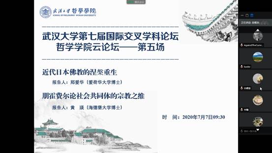 7月7日上午,第五场云论坛上,爱荷华大学博士郑爱华、海德堡大学博士黄瑛分别带来了题为《近代日本佛教的涅槃重生》、《朋霍费尔论社会共同体的宗教之维》的学术报告。郑爱华博士指出,面对明治维新时期日本大规模的排佛运动,日本主张汉传大乘佛教的正统性,力挽日本佛教于既倒,为其在日本和西方发展奠定了基础。黄瑛博士探讨了朋霍费尔著作《圣徒相通》中的人格、共同体、上帝概念,她指出,在朋霍费尔看来,这三者之间具有本质联系,对任何一个的强调都不应削弱另外两者的现实性,借助对这种本质联系的阐发,他重新诠释了例如个体自由、群体的伦理责任以及宗教共同体等基础概念,为德国德国魏玛共和国的黄金“二十年代”增添了重要的思想果实。