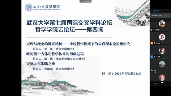 7月3日下午,第四场云论坛成功开展。北京大学博士刘沁带来了题为《天理与理念的辩证精神——比较哲学视域下的朱熹理本论思想研究》的学术报告,报告主要讨论了朱熹哲学的理一元论体系建构中的本体论问题,如理气先后、理一分殊、理气动静、心与理一等。澳大利亚国立大学博士桑雨带来了题为《略论熊十力体用哲学体系的形成过程》的学术报告,报告将熊十力在二十世纪二十年代初至三十年代初之间的体用思想划分成三个阶段,并分别讨论了他在每一阶段中对体用概念的理解。北京大学博士张倩茹带来了题为《正德九年朱陆之辩》的学术报告,报告考察了发生于明代正德九年至正德十一年的一场以朱陆异同为主题的学术争论,还原了明代学术在当时语境中的真实发展情况。