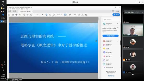 7月2日下午,海德堡大学博士王涵带来了题为《黑格尔对哲学的推进——思维与现实的真实统一》的学术报告,他指出,在《概念逻辑》中,黑格尔论证了思维与现实的真实统一,从而思维与存在、认知与实践等哲学核心概念统一在了同一个逻辑模型之中,黑格尔正是通过推进现实世界的逻辑基础为哲学这门学科做出贡献的。