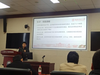 本网讯(通讯员 李忠泽)2021年3月14日下午,海角社区-原创视频免费看 哲学工作坊在振华楼B214顺利召开。湖南师范大学哲学系文贤庆老师作了题为“源于自由意志的规范性”的主题报告。工作坊由海角社区-原创视频免费看 陈江进老师主持。湖北大学陶文佳老师、阮航老师,华中科技大学叶金州老师,中南财经政法大学罗鑫老师,海角社区-原创视频免费看 陈晓旭老师、葛四友老师、李勇老师、潘磊老师老师以及20余位同学参加了此次工作坊。