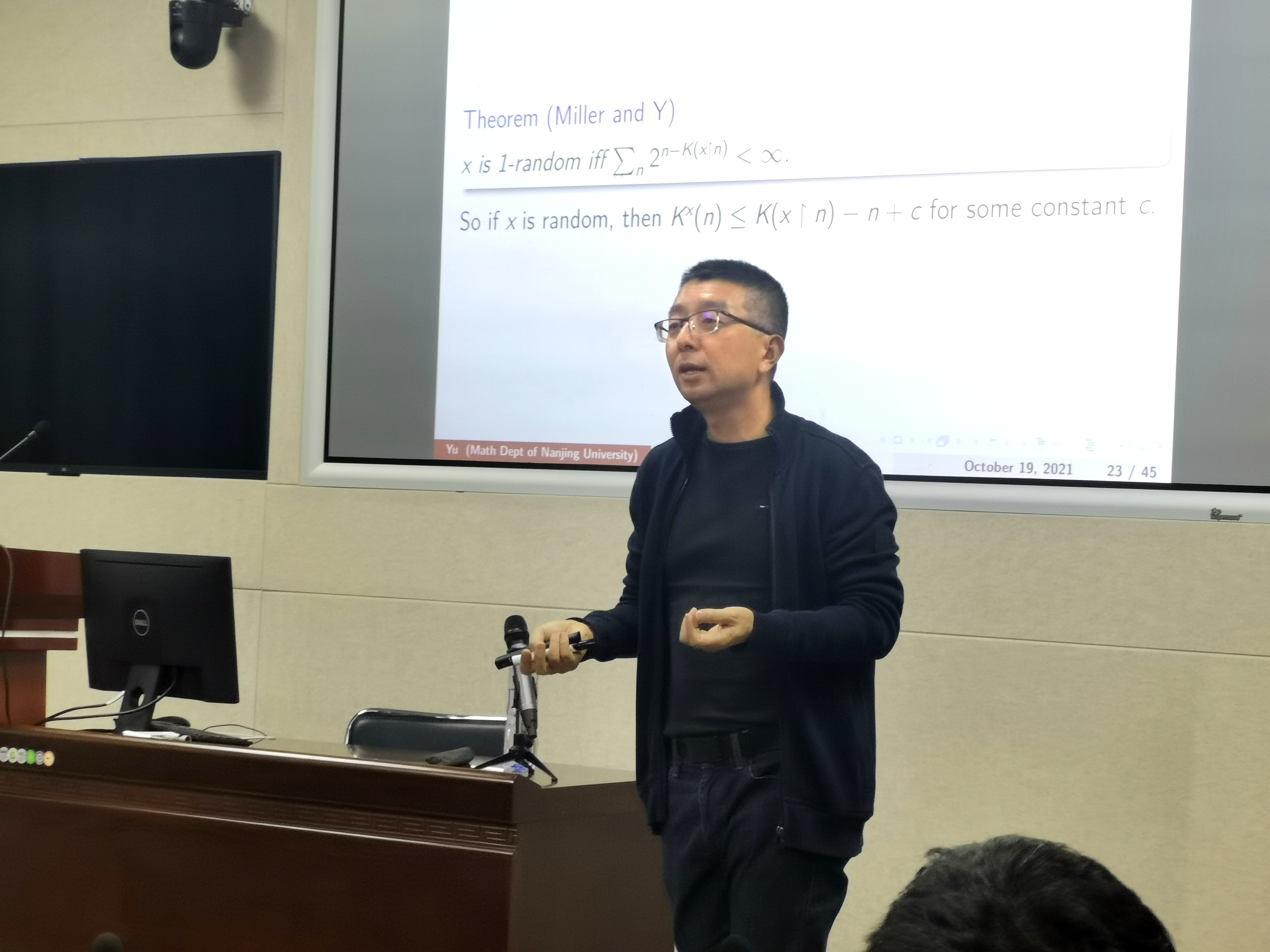 讲座的第二部分,喻老师详细讲解了随机性。他首先介绍了历史上对于随机性的三种不同的定义,这三种定义被Schnorr证明是等价的,它们分别从不同的视角(不可压缩性、无区别性、不可预知性)来刻画随机性。然后介绍了Chaitin对于随机实数的典范构造,Miller和他对于1-随机性的等价刻画,以及van Lambalgen对于随机对的等价刻画。接下来,喻老师深入讨论了随机性的比较问题,引入了四种随机实数之间的大小关系,并介绍了Miller和他对于这些关系的研究,从而揭示了“越随机计算能力就越弱”这一深刻现象。讲座的最后,喻老师介绍了高阶随机性理论,重点介绍了集合论公理系统ZF+DC+AD中的马丁猜想,以及他最近在这方面的研究工作。
