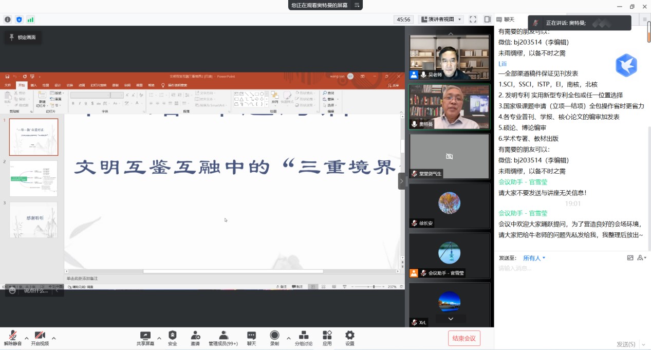 本网讯(通讯员官雪莹)12月30日,应武汉大学文明对话高等研究院邀请,新疆师范大学牛汝极教授向武汉大学及社会各界的听众,作题为“文明互鉴互融中的‘三重境界’”的线上学术讲座。武汉大学哲学院教授、文明对话高等研究院院长吴根友教授主持讲座。