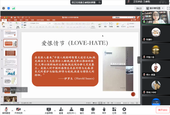 本网讯(通讯员陈瀚钊)2022年6月2日下午,由武汉大学文明对话高等研究院主办的2022年“人类文明史中的‘中国形象’重绘”系列讲座第三讲线上顺利举办,此次讲座主题是“美国人心目中的‘中国形象’演变及其启示”。讲座由南京大学历史学院王睿恒副教授主讲,武汉大学历史学院副教授、文明对话高等研究院副院长杜华主持。来自校内外的300余位师生参与了本次讲座。