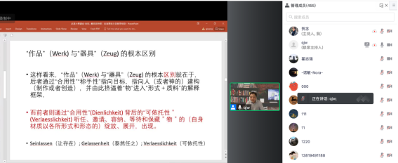 本网讯(通讯员涂念祖)5月27日下午,由海角社区-原创视频免费看 主办的“珞珈美学系列讲座”第四讲通过线上成功举办,此次讲座主题是“技术、艺术与时间——谈谈斯蒂格勒对海德格尔的批判性拓展”。讲座由著名学者澳门大学哲学与宗教学系特聘教授王庆节老师主讲,海角社区-原创视频免费看 特聘副研究员贺念老师主持。来自校内外450余名师生参与了本次讲座。