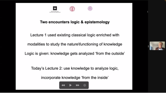 范本特姆教授最后总结到,截至目前,我们讨论了两种不同的认知逻辑,其一是建立在以真为基础的经典命题逻辑之上,添加新的认知算子,厘清知识和其他认识论概念的认知逻辑,这可被称为逻辑与哲学交叉的显性立场。其二是放弃对真的坚持,从知识或信息的角度出发构建的认知逻辑。他强调,从知识或信息的角度出发的认知逻辑更接近逻辑的核心,也更为隐蔽。这被称为逻辑与哲学交叉的隐性立场。这两种出于不同立场的逻辑通常是可互译的。例如从直觉主义逻辑到S4逻辑的哥德尔翻译。无论我们的立场如何,都可以得出认识论(哲学)和逻辑的交叉可以提供丰富的研究素材的结论。