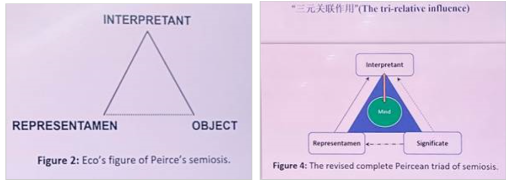 紧接着,余红兵老师通过指出Eco’s figure of Peirce’s semiosis存在的三大问题,来给出自己对semiosis三元关联关系的构造。余红兵老师将object换成了significate,因为object本身的语义较多,而我们所讲的object本身是符号性的,如果换成significate,译为意指项,就可以突显处object的符号性,但同时余老师表示也可以遵循皮尔士的文献继续使用object。代表项(representamen)通过阐释项(interpretant)代表着某种意指项(significate)。一切的出发点是object或者说是significate,阐释项来表达符号媒介在解释者头脑里所唤起的“心理效应”或者“思想”, 符号意指过程(semiosis)就是从代表项(representamen)到对象或者说意指项(significate)再到阐释项(interpretant)的一个相对完整的过程,符号意义的产生就是符号对象和代表项三者之间动态反应的结果。