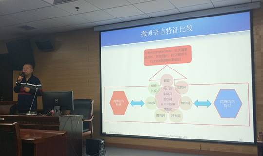 讲座中,朱教授特别举出两个例子来说明大数据机器学习在心理特征预测上的应用:一是建立微博用户的人格预测模型:首先要通过微博平台抓取相关数据,然后用心理量表对用户数据进行标注,总结出微博特有的行为特征,并以此为依据进行数据的特征提取,最后要利用标注的数据训练出个体模型;二是用微博数据研究家庭暴力对心理的影响,计算受害者前后心理特征,前后人格变化等。