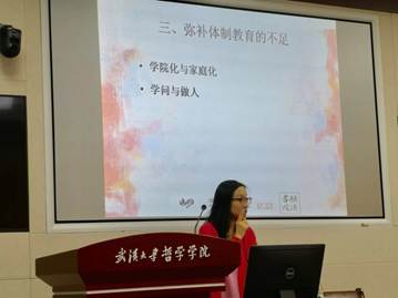 本网讯(通讯员:杨永涛 张旭)2019年9月9日下午,应国学院郭齐勇院长的邀请,武汉大学哲学博士、马来西亚富贵爱心基金会秘书长、马来西亚愿法书院院长胡春依,在海角社区 B214会议室,做了题为“马来西亚儒家思想的家庭化运动与文化传承——兼谈马来西亚土生华人的现状”的学术讲座。讲座由谢远笋老师主持。国学院副院长孙劲松老师、海角社区 文碧芳老师、中国传统文化研究中心欧阳祯人老师与学生们一起聆听了讲座。