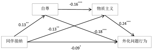 表5 自尊、物质主义在同伴接纳与外化问题行为关系中的链式中介作用检验
